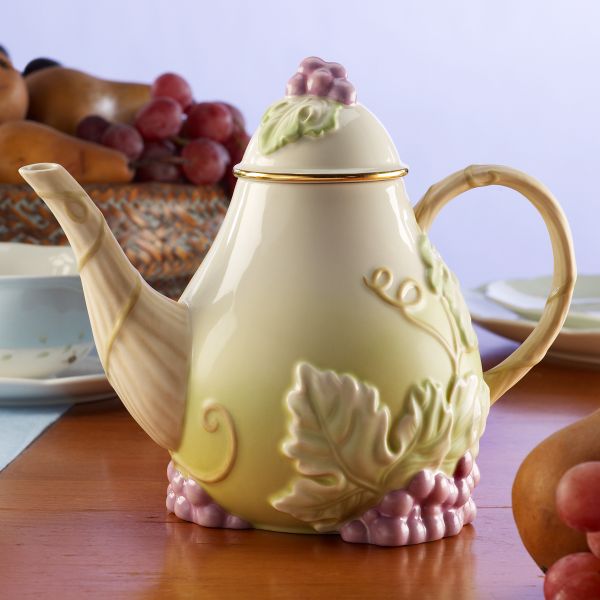It's a pear... it's a teapot... it's a pear-shaped teapot! With distinctive shape of this sweet summer fruit, the artists of Lenox have created a graceful china teapot. A treasure of bas-relief sculpting, Teatime Pear-fection is a feast for the eyes with leaves, grapes, and curling vines twisting up the side, spout and handle. Hand painting adds subtle washes of purple, green and brown. This 32-ounce teapot makes a lovely gift, as well.