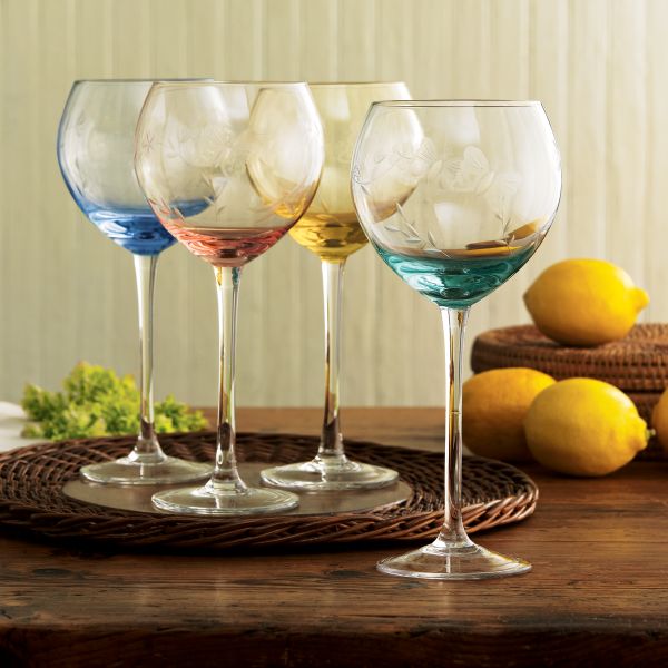 Even when these glasses are filled with wine, you still can appreciate their distinctive colors. That's because each glass is bathed in a different hue that pools at the bottom of the bowl. And when the glasses are filled with red wine, the wine's color will provide a rich backdrop for the butterflies etched into the fine crystal.